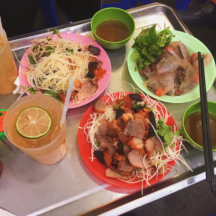Điều tạo nên sức hút đặc biệt của con phố Đinh Tiên Hoàng chính là quán nộm bò khô số 53. Miếng thịt bò được tẩm ướp lịm nguyên hương, cùng với đu đủ xanh, rau thơm, lạc rang tạo nên hương vị đặc trưng, làm người ăn khó mà quên được. Giá mỗi suất nộm khoảng 40.000 đồng, một mức giá hợp lý cho bữa trưa ngon miệng.