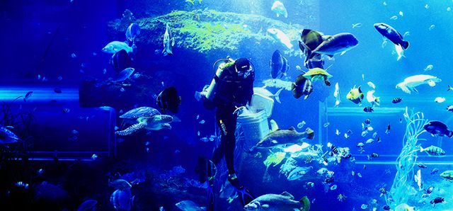 - Thuỷ cung: Đi du lịch Vinpearl Nha Trang mà lại không ghé thăm Thủy cung hiện đại nhất Việt Nam thì quả thật là tiếc. Thuỷ cung có diện tích lên đến 3400m2, trưng bày hơn 3000 sinh vật biển lạ mắt và quý hiểm từ nhiều quốc gia trên thế giới. Bạn sẽ được chiêm ngưỡng muôn loài sinh vật biển rực rỡ màu sắc trong lòng đường hầm hiện đại, cảm tưởng như đang lạc vào thế giới dưới lòng đại dương kì thú. Ngoài ra, đừng bỏ lỡ những chương trình biểu diễn nghệ thuật độc đáo như chương trình “Nàng tiên cá” (11h00 – 11h10 hoặc 15h00 – 15h10) với những nàng tiên cá xinh đẹp như bước ra từ chuyện cổ tích và chương trình cho cá ăn (10h00 – 10h15 hoặc 17h00 – 17h30) với những anh thợ lặn khoẻ khoắn chăm sóc cho các “cư dân” Thuỷ cung nhé!