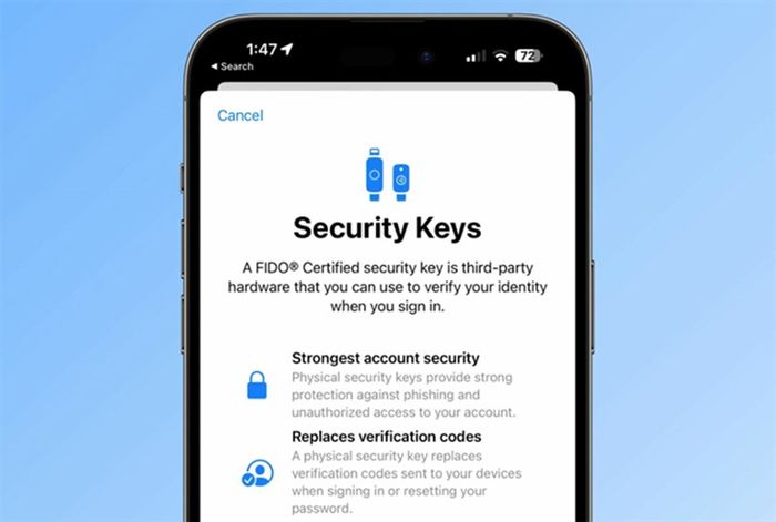 Security Keys là tính năng bảo mật dành cho ID Apple. Nguồn: MacRumors.Tính năng này giúp người dùng có thể thêm khóa bảo mật từ các ứng dụng thứ ba qua USB, kết nối Lightning, Bluetooth, NFC để đăng nhập vào tài khoản Apple ID hoặc xác thực thiết bị mới một cách dễ dàng và an toàn hơn.