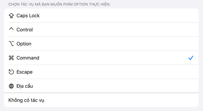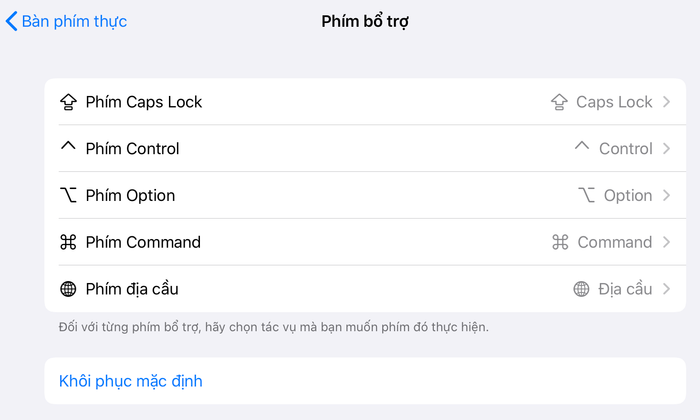 Bàn phím Windows thường có phím alt gần phím cách, sau đó là phím cửa sổ và phím control ở góc dưới cùng bên trái. Để thích nghi với iPad, người dùng cần phải chỉnh sửa vị trí của các phím này. Trên iPadOS 13.4, bạn có thể thực hiện điều này thông qua Cài đặt chung -> Bàn phím -> Bàn phím thực -> Phím bổ trợ. Tại đây, bạn có thể gán tác vụ cho các phím Caps Lock, Control, Option, Command và phím địa cầu theo ý thích của mình để tối ưu trải nghiệm sử dụng...