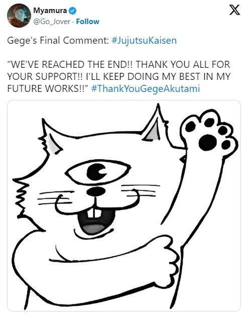Trong một bài viết gần đây trên Manga Musings do Viz chia sẻ, Gege Akutami đã nói: 'Đây là chương cuối cùng! Cảm ơn mọi người đã ủng hộ! Tôi sẽ nỗ lực hết mình cho thử thách tiếp theo!'