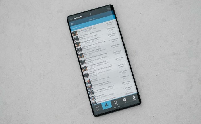Trong bài test đồ hoạ GFXBench, Pixel 6 Pro thể hiện khá tốt với quá trình render rất mượt. So với chiếc máy x sử dụng Snapdragon 888+, Mali-G78 trên Tensor chạy khung hình gần như tương đương với Adreno 660 của Snapdragon 888+. Độ mượt render của cả hai cũng như nhau.