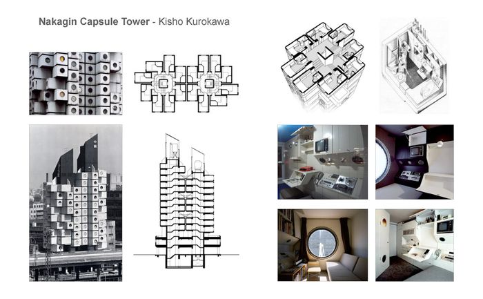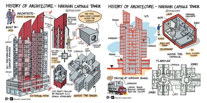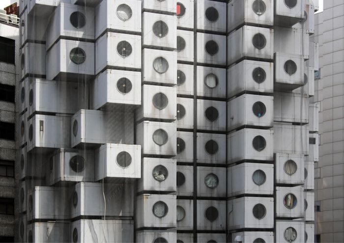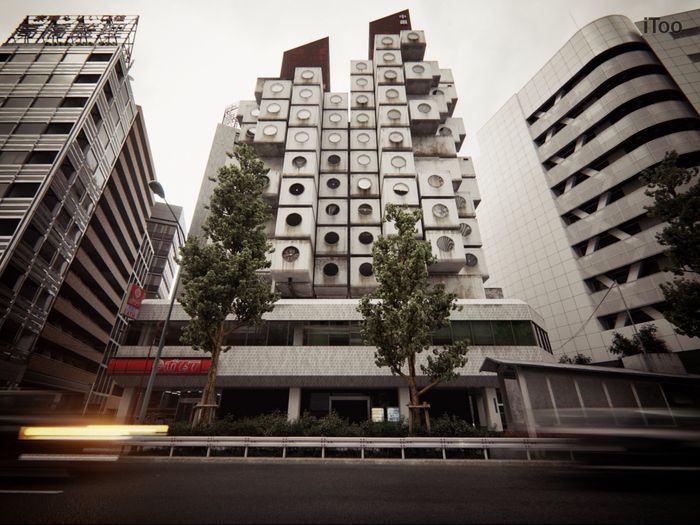 Nằm tại khu phố Ginza, Nakagin Capsule Tower được xây dựng trong thời gian ngắn chỉ trong 30 ngày vào năm 1972. Với hàng chục căn hộ theo dạng capsule có cửa sổ tròn lớn, mỗi cái có thể tháo ra và thay thế độc lập. Từ bên ngoài, toà nhà trông giống như một tổ hợp của các máy giặt được xếp chồng lên nhau. Các căn hộ này có thể gắn vào hoặc tháo ra một cách dễ dàng, đánh dấu một ý tưởng táo bạo vào thời điểm đó.