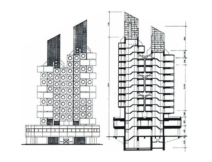 Phần lớn các căn hộ đã rơi vào tình trạng xuống cấp từ năm 2007 và đối mặt với nguy cơ phá dỡ. Mỗi căn hộ được thiết kế như một căn nhà nhỏ, với diện tích chỉ 10m2 và được gắn vào 2 lõi bê tông. Mỗi căn hộ đều có thể thay thế mà không ảnh hưởng đến những căn khác. Chúng được trang bị với các tiện ích như bàn gấp, giường xếp và nhà vệ sinh nhỏ gọn tương tự như trong máy bay.