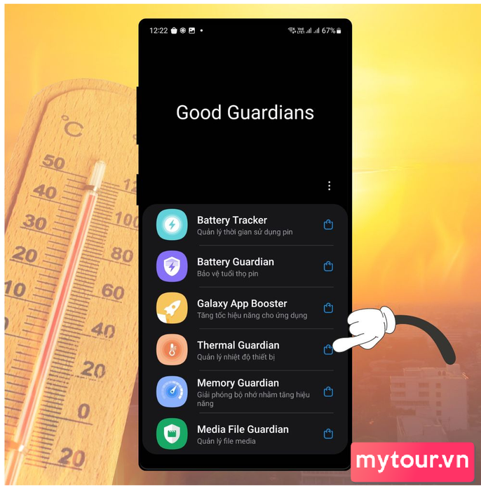 Bước 2: Sau khi hoàn tất cài đặt, khởi động ứng dụng Good Guardians. Bạn sẽ thấy 6 chức năng khác nhau, tương ứng với 6 ứng dụng nhỏ. Trong menu đó, chọn Thermal Guardian vì đây là công cụ quản lý nhiệt độ cho điện thoại.