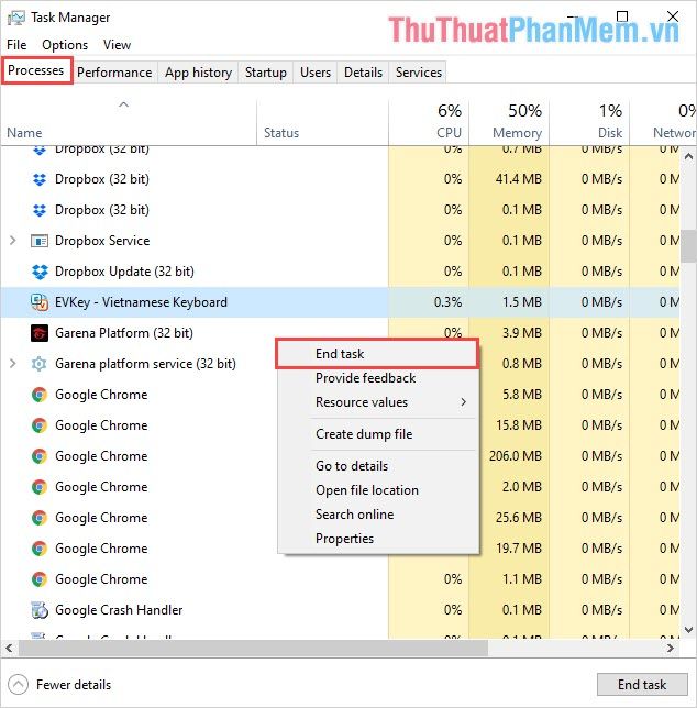 Bước 2: Tiếp theo, bạn vào mục Processes và kéo xuống tìm bộ công cụ gõ Tiếng Việt đang chạy. Sau đó, bạn Click chuột phải và chọn End task để tắt chúng.