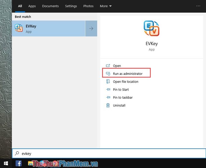 Bước 3: Cuối cùng, bạn mở MenuStart và nhập tên bộ công cụ gõ tiếng Việt đang sử dụng, sau đó chọn Run as administrator.
