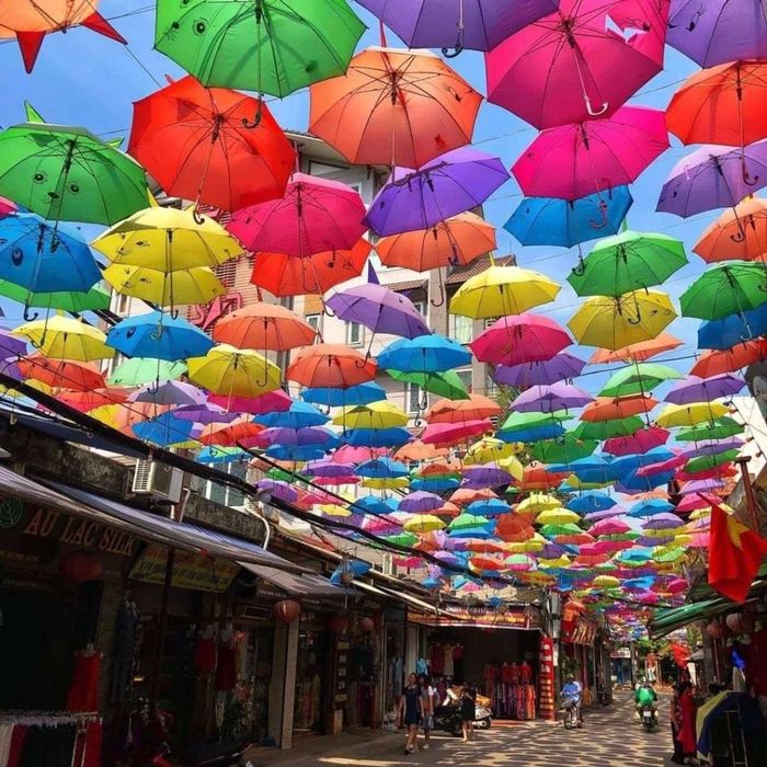 Phần ô treo dài với màu sắc và họa tiết độc đáo tạo điểm nhấn đặc biệt cho con đường. Làng Vạn Phúc giữ gìn nét truyền thống và bản sắc dân tộc qua nghệ thuật thêu dệt lụa. @your_username