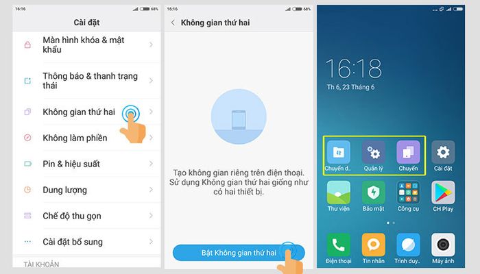 Với tính năng độc đáo trên MIUI 8, bạn có thể thiết lập hai không gian sử dụng khác nhau trên điện thoại, tương tự như tài khoản người dùng trên máy tính. Mỗi không gian hoạt động độc lập với cấu hình ứng dụng, ảnh, mật mã, tập tin và chủ đề riêng biệt.