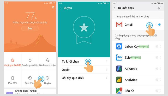 Chọn app Bảo mật > Quyền -> Tắt các ứng dụng không muốn chạy ngầm như Messager Facebook
