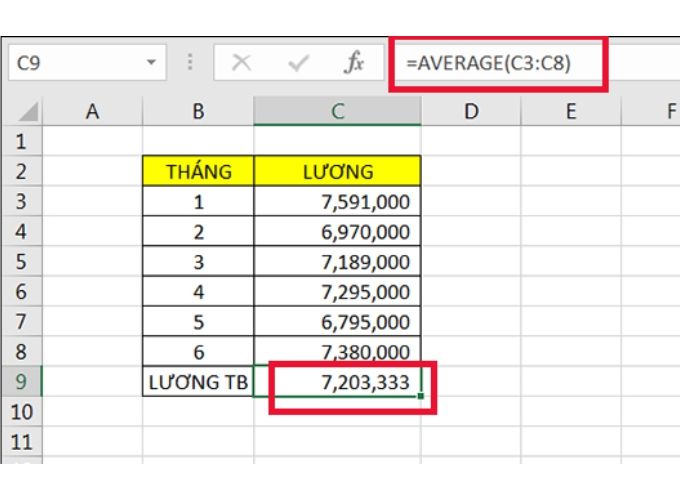 Đây là một trong 150 hàm excel thường dùng và ví dụ: Để tính lương trung bình dựa trên thông tin bảng dưới đây, bạn có thể sử dụng công thức như sau: =AVERAGE(C3:C8). Kết quả sẽ là giá trị trung bình của lương trong 6 tháng.