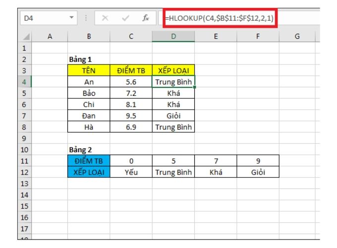 Để xếp loại học sinh trong Bảng 1 (B3:D8) dựa trên điểm số ở Bảng 2 (B11:F12), sử dụng công thức: =HLOOKUP(C4, $B$11:$F$12, 2, 1) tại ô D4. Hàm sẽ tìm giá trị điểm ở ô C4 trong Bảng 2 và trả về xếp loại tương ứng từ hàng 2.