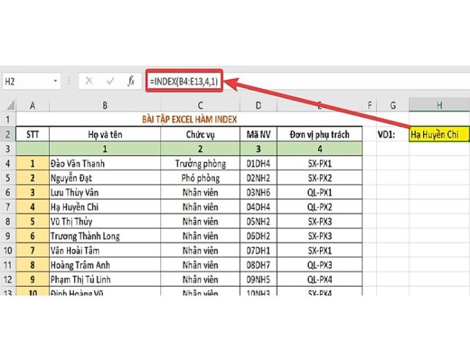 Hàm INDEX trả về giá trị hoặc tham chiếu tới một giá trị trong bảng.