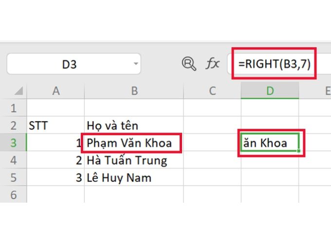 - số_ký_tự: Số lượng ký tự mà hàm RIGHT sẽ trích xuất.