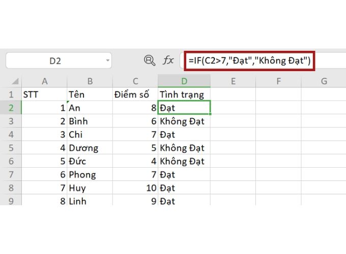 Tại ô D2, bạn có thể sử dụng công thức như sau: =IF(C2>=7, “Đạt”, “Không Đạt”), và kết quả sẽ hiển thị như trong ví dụ trên.