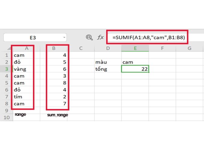 Ví dụ: Để tính tổng số lượng màu cam trong cột A dựa trên số lần xuất hiện trong cột B, bạn có thể sử dụng công thức: =SUMIF(A1:A8, “cam”, B1:B8).