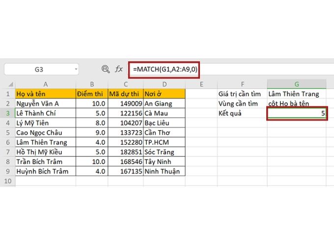 Để tìm vị trí của “Lâm Thiên Trang” trong danh sách học sinh (A2:A9), sử dụng công thức: =MATCH(“Lâm Thiên Trang”, A2:A9, 0) tại ô G3.