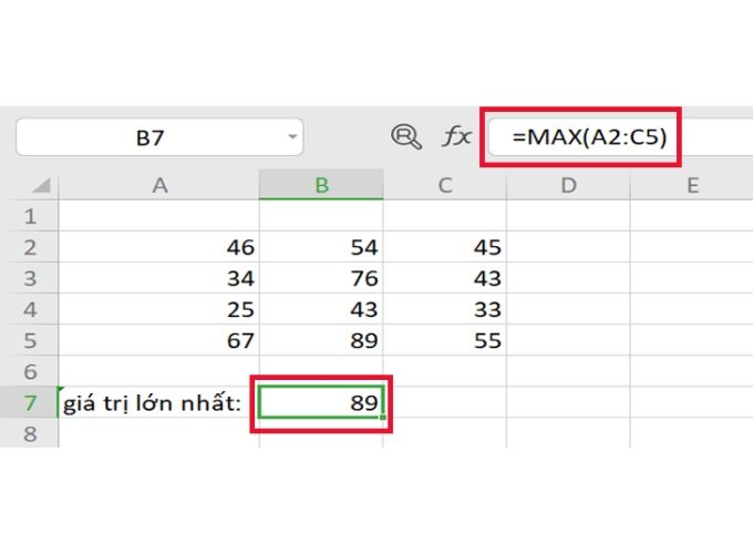 Ví dụ: Để tìm giá trị lớn nhất trong một phạm vi dữ liệu, bạn có thể sử dụng công thức như sau: =MAX(A2:C5). Kết quả sẽ là giá trị lớn nhất trong vùng dữ liệu từ ô A2 đến C5, và trong ví dụ này, nếu có giá trị là 89, nó sẽ là giá trị lớn nhất cần tìm.