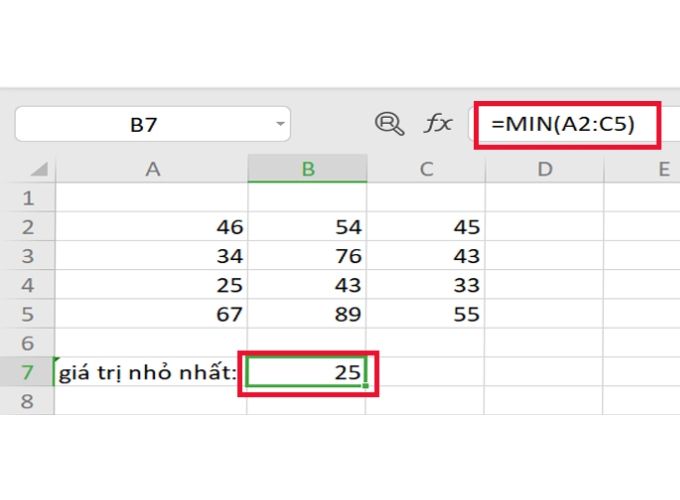 Ví dụ: Để tìm giá trị nhỏ nhất trong một phạm vi dữ liệu, bạn có thể sử dụng công thức như sau: =MIN(A2:C5). Kết quả sẽ là giá trị nhỏ nhất trong vùng dữ liệu từ ô A2 đến C5, và ví dụ này có thể trả về kết quả là 25 là giá trị nhỏ nhất cần tìm.