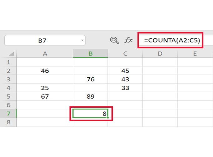 Ví dụ: Để đếm số lượng ô chứa kí tự hoặc số trong bảng dữ liệu, bạn có thể sử dụng công thức như sau: =COUNTA(A2:C5). Kết quả sẽ là số lượng ô không trống chứa kí tự hoặc số trong vùng dữ liệu đã chọn.