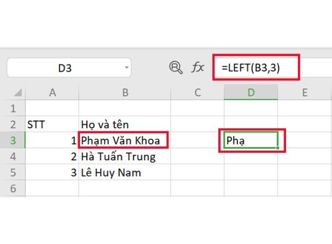 Ví dụ: Trong bảng dưới đây, để trích xuất 3 ký tự đầu tiên từ ô B2, bạn có thể sử dụng công thức: =LEFT(B3, 3). Sau khi nhập công thức này, nhấn Enter và bạn sẽ nhận được kết quả như được hiển thị trong hình.