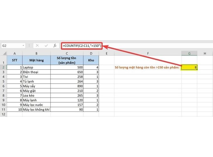 Để thống kê số lượng mặt hàng có tồn kho trên 150 sản phẩm, bạn có thể sử dụng công thức như sau: =COUNTIF(C2:C11, “>150”).