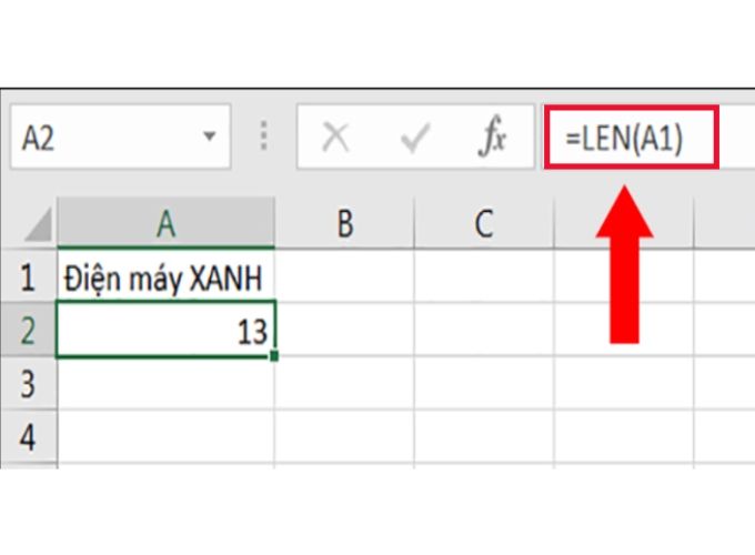 Trong ví dụ, chúng ta sử dụng hàm LEN để đếm số ký tự trong ô A1 chứa chuỗi “Điện máy XANH”. Công thức: =LEN(A1), kết quả là độ dài của chuỗi, bao gồm cả khoảng trắng.