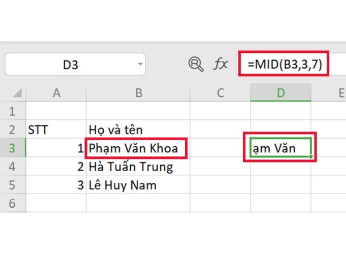 Ví dụ: Trong ví dụ dưới đây, để lấy 7 ký tự từ ô B2, bắt đầu từ vị trí thứ 3, bạn có thể sử dụng công thức: =MID(B3, 3, 7). Sau khi nhập công thức này, nhấn Enter và bạn sẽ nhận được kết quả “ạm Văn”.