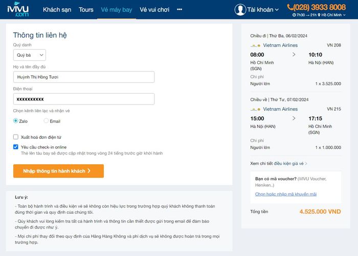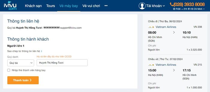 - Nhập thông tin cá nhân liên hệ khi đặt vé và tên của hành khách tham gia chuyến bay.
