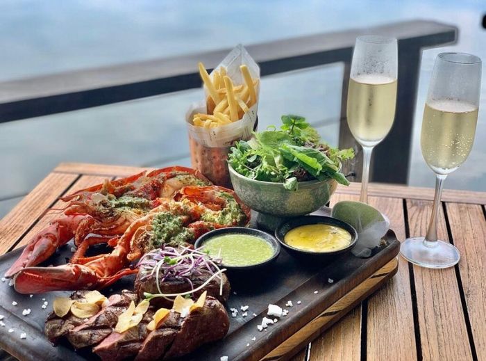 Các món ăn ngon, được trang trí đẹp mắt, từ salat tôm hùm, steak thơm mịn đến ly rượu vang hảo hạng.