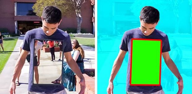 Tưởng như bạn có thể nhìn xuyên thấu qua anh chàng này nhỉ? Thực ra bạn đang nhìn vào một chiếc màn hình, phát lại những gì thu được từ chiếc camera giấu phía sau lưng mà thôi.