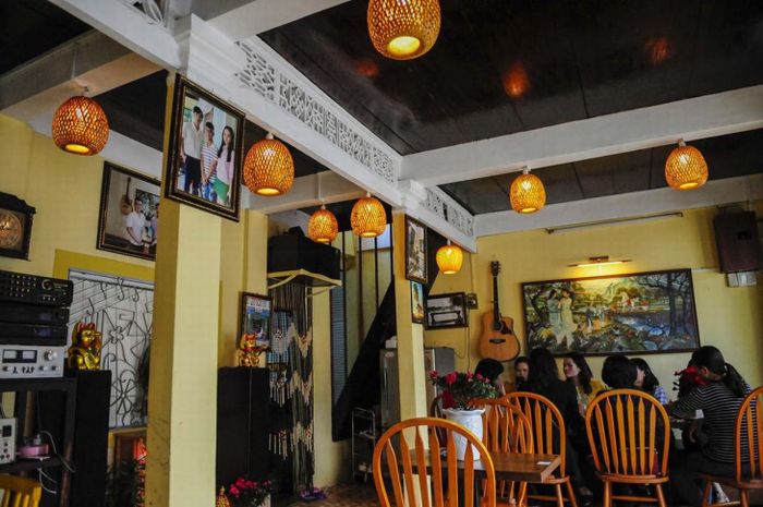 Không gian bên trong của Cafe Mắt Biếc vẫn giữ nguyên vẻ đẹp của bối cảnh trong phim, tạo nên một không gian gần gũi và quen thuộc. Nội thất của quán mang đậm chất hoài niệm với bàn ghế gỗ đơn giản trên nền nhà lát gạch với hoa văn vintage.