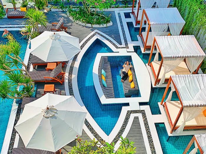 Khu vực hồ bơi có ghế nằm tắm nắng, lều nghỉ ngơi, và quầy bar phục vụ đồ uống và đồ ăn nhẹ. Từ 9 giờ sáng, không gian sẽ thêm phần sôi động với âm nhạc, tạo nên bầu không khí mùa hè sôi động.