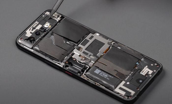 Bên trong ROG Phone 6 được chia thành 5 khu vực rõ ràng. Tổng thể trông gọn gàng và chỉn chu. Viên pin được tách thành hai phần riêng biệt, xen giữa là bo mạch chủ. Thiết kế này thông minh và mang lại nhiều lợi ích.
