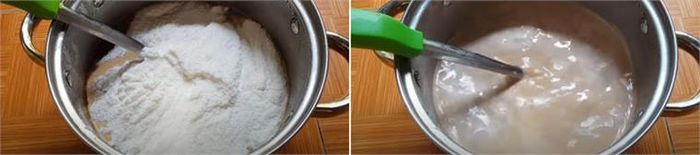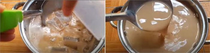 + Đun sôi 1l nước lọc, sau đó cho hỗn hợp đường và bột rau câu vào nồi. Khuấy đều cho hỗn hợp tan và đun khoảng 5 phút cho rau câu chín và màu trắng. Tắt bếp và để nguội.