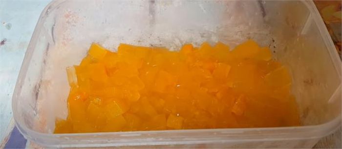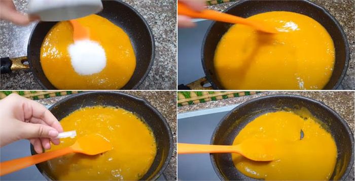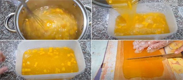 + Thêm 100 gr phần thịt và 100 gr xoài đã xay nhuyễn vào nồi. Khuấy đều và đổ hỗn hợp vào khay làm thạch, sau đó để nguội trong tủ lạnh khoảng 2 - 3 tiếng. Cắt thành từng miếng thạch rau câu xoài.