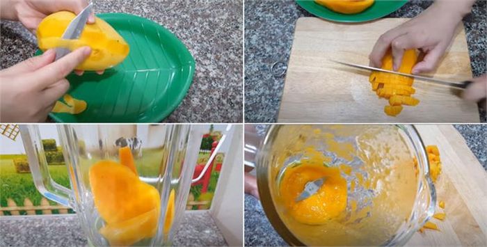 + Rửa sạch xoài chín, gọt vỏ và bỏ hạt, cắt thành từng miếng nhỏ vuông.