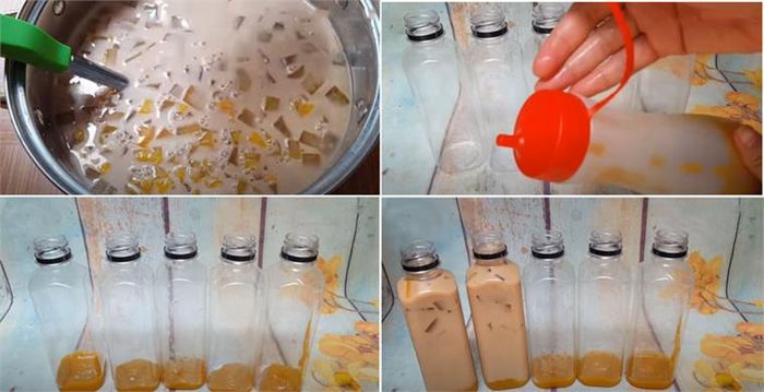 + Đổ nước sốt xoài vào lọ nước tương sạch, rồi cho từng chai trà sữa xoài và đậy nắp. Sau đó, để chai vào tủ lạnh.