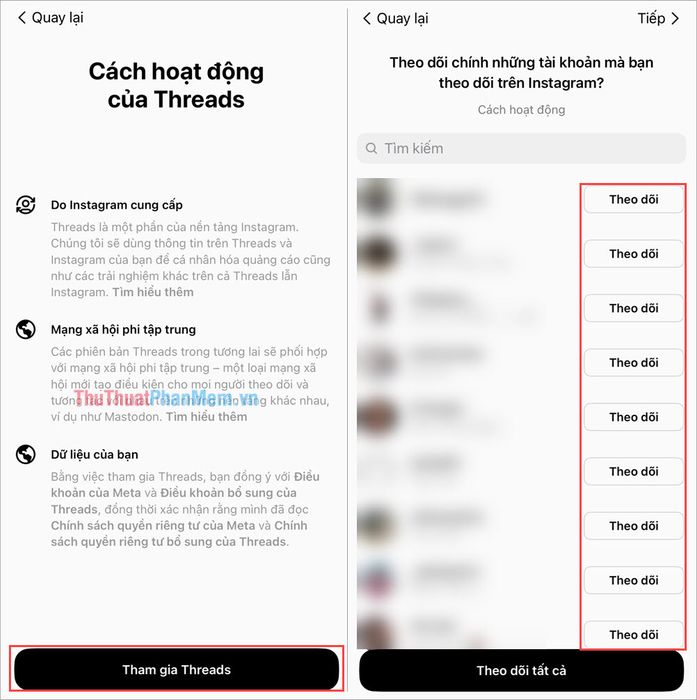 Sau khi đăng ký tài khoản Threads thành công, hệ thống sẽ đề xuất những người bạn có thể theo dõi dựa trên danh sách theo dõi từ Instagram. Bạn có thể lọc và theo dõi từng người hoặc chọn Theo dõi tất cả để theo dõi toàn bộ người bạn đang theo dõi trên Instagram.