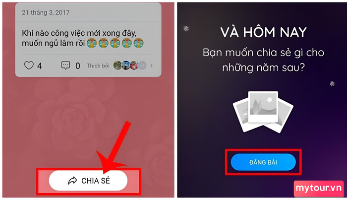 Nhấn vào Chia sẻ ở phía dưới màn hình. Bạn sẽ dễ dàng chia sẻ khoảnh khắc đặc biệt của mình với mọi người. Nếu bạn muốn đăng nội dung mới hôm nay, chỉ cần bấm Đăng bài ở cuối màn hình Kỷ niệm năm xưa.