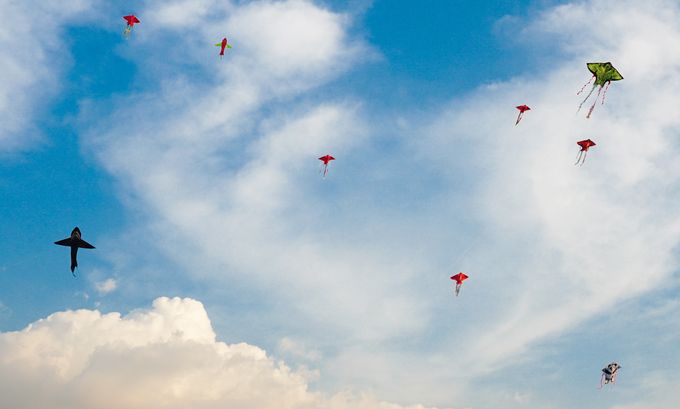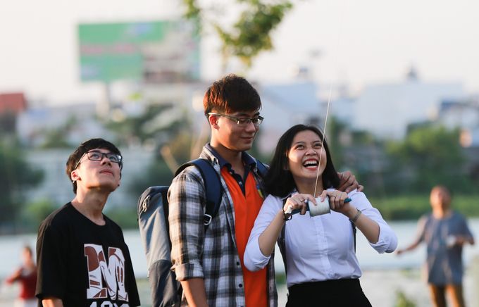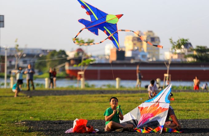 Trong những ngày đầu hè, khu vực bờ kè kênh Thanh Đa rực rỡ với hàng trăm cánh diều vút bay mỗi buổi chiều.