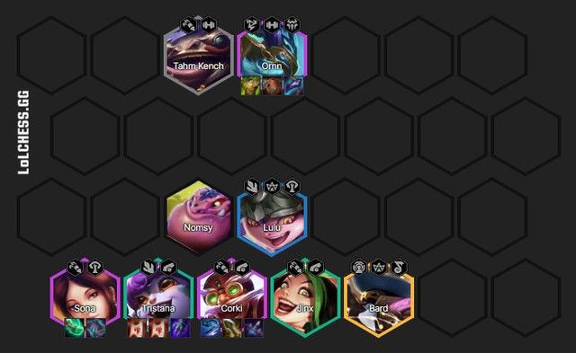 Đội hình Pháo Thủ - Lễ Hội gây damage đa dạng từ vật lý đến phép thuật. Tận dụng 'gian lận quân số' từ tộc Luyện Rồng, đội hình chiếm ưu thế ở đầu trận. Sona và Ornn làm choáng và hất tung diện rộng.