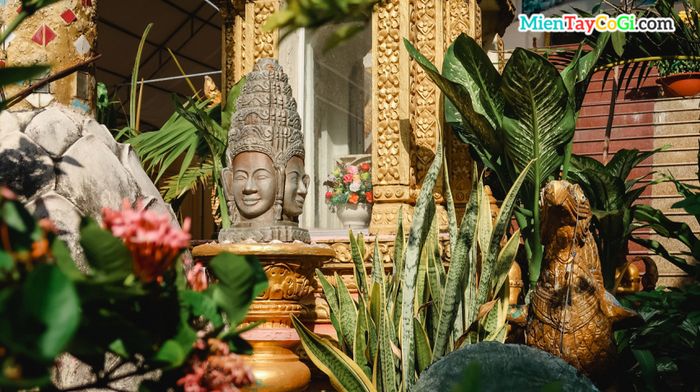 Ở giữa trước chánh điện có một bảo tháp nhỏ được che phủ bởi chậu cây và cột cờ phía trước. Xung quanh bảo tháp là những tượng thần đặc trưng của người Khmer: Nữ thần Keynor, chim Krud, Phật 4 mặt, Reahu, chằn Yeak,... Mỗi tầng bảo tháp chứa một tượng Phật nhỏ của Phật Thích Ca. Phản ánh sự tôn kính của người Khmer.