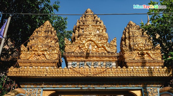 Ngay khi bước vào, bạn sẽ ngay lập tức cảm nhận sự hấp dẫn từ cổng chùa. Phần nóc của cổng có ba ngọn tháp tam bảo, mỗi tầng cao lên. Ở trung tâm là ngọn tháp cao nhất với chữ Khmer វត្ត មុនីរង្ – dịch sang tiếng Việt là Muniransay.