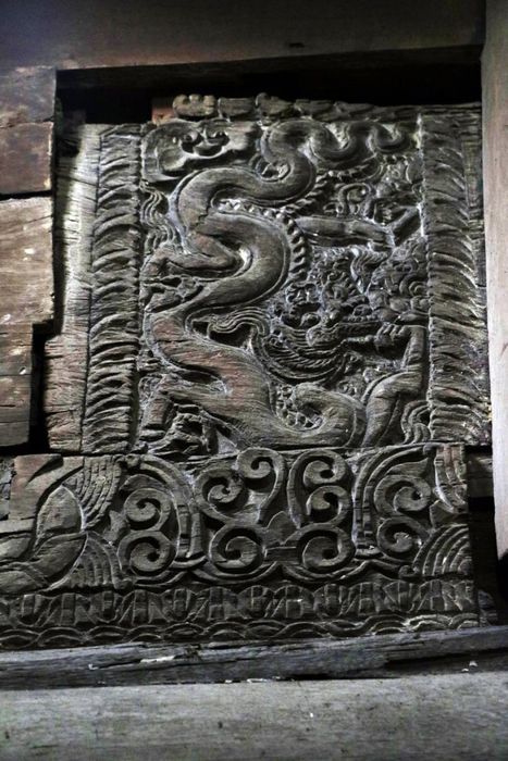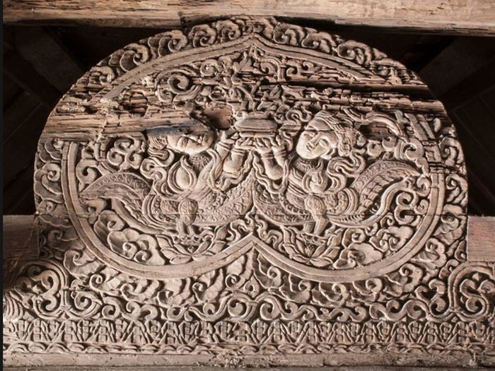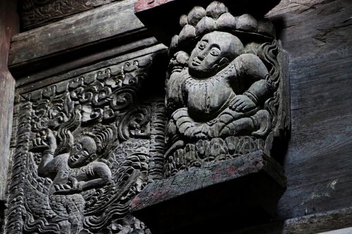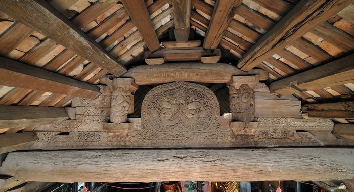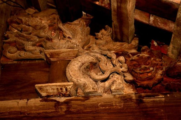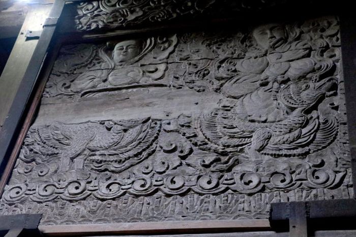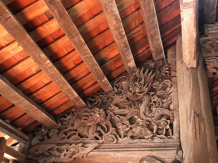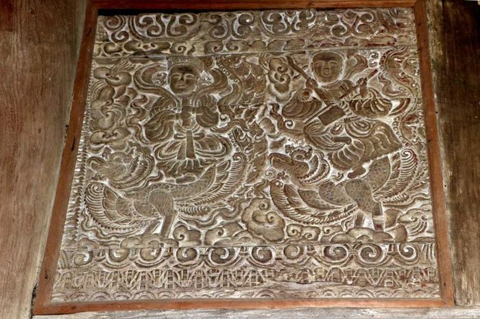 16 bức chạm trổ được sắp xếp từ gian ngoài vào gian trong. Những bức chạm đa dạng về đề tài với kỹ thuật nổi bong. Nét chạm bằng đục và các thớ gỗ tạo nên vẻ mềm mại, uyển chuyển, huyền bí như những bức tranh.