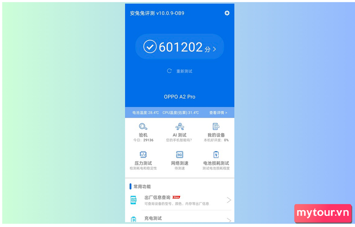 Về cấu hình, OPPO A2 Pro sử dụng chip Dimensity 7050, công nghệ tiến trình 6nm, GPU Mali-G68 MC4, kết hợp với RAM 8GB và ROM 128GB, 256GB hoặc 512GB. Điểm hiệu năng đạt 601,202 điểm theo AnTuTu Benchmark, cho thấy hiệu suất ổn định.