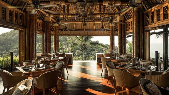 Nhà hàng được trang trí bằng mây tre, với đèn và quạt thiết kế Á - Âu độc đáo. @ Four Seasons Resort Koh Samui