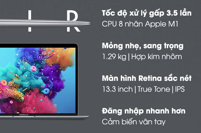 - CPU: Apple M1. - RAM: 8 GB. - Ổ cứng: 256 GB SSD. - Màn hình: 13.3 inch. - Card màn hình: Card tích hợp - 7 nhân GPU. - Cổng kết nối: Thunderbolt 3 (USB-C), Jack tai nghe 3.5 mm. - Trọng lượng: 1.29 kg. |