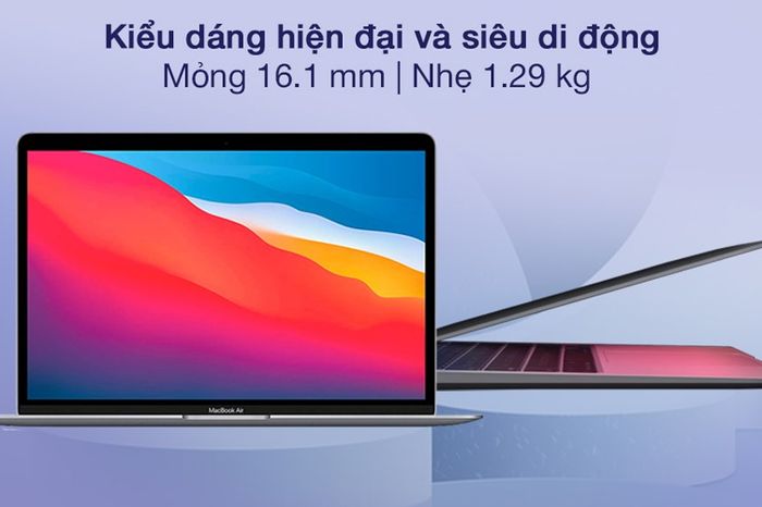 Laptop MacBook Air M1 2020 8-core GPU RAM 16GB tỏa sáng với thiết kế tinh tế, với trọng lượng nhẹ 1.29 kg và vỏ kim loại chắc chắn.