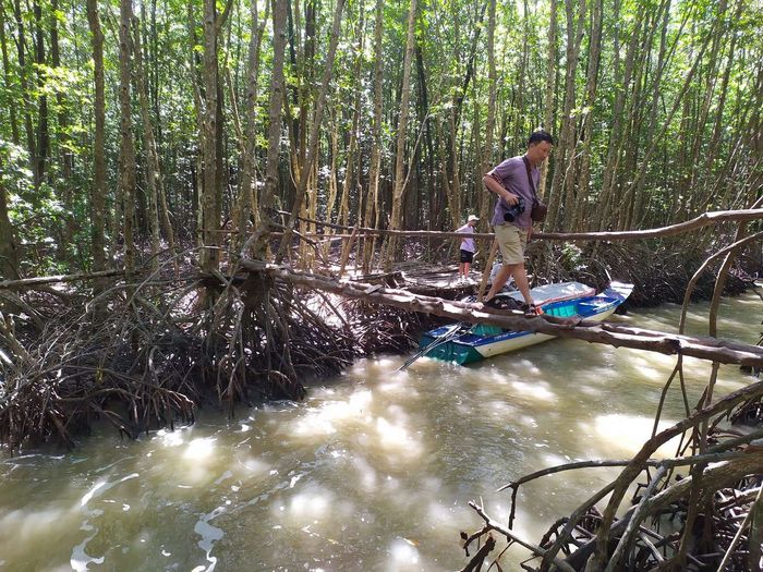 Để thấu hiểu sâu hơn về khu rừng này, du khách có thể dạo chơi thêm vài trăm mét để mua vé tham quan Vườn Quốc gia Mũi Cà Mau. Với giá vé 100k/người, bạn sẽ được trải nghiệm một chuyến thuyền thú vị kéo dài khoảng 1h30 phút.